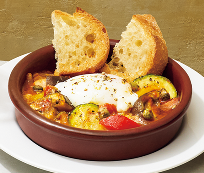 イタリア料理の定番野菜とトマトソースを合わせ、半熟卵でまろやかに。