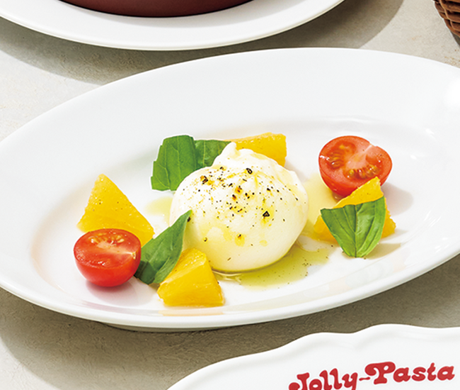 オレンジの甘み広がる、ブッラータチーズとオレンジのカプレーゼ。